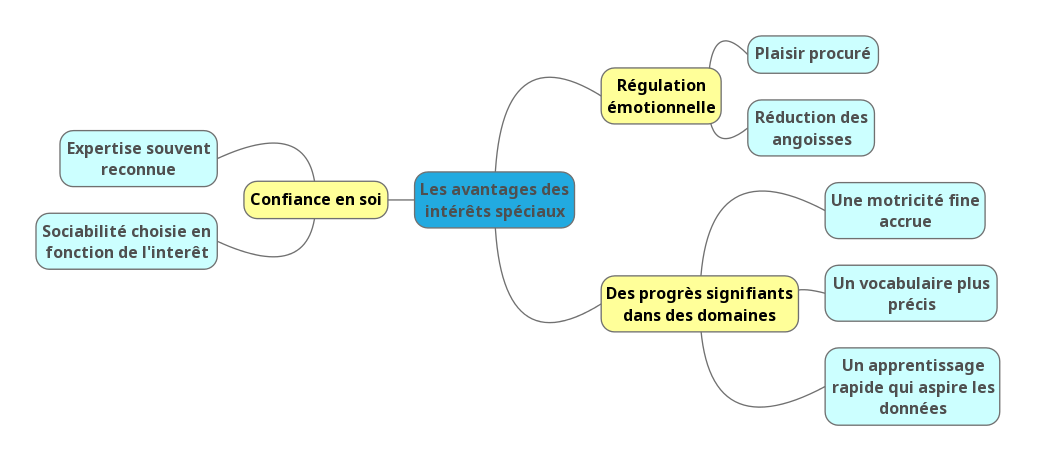 Au terme de ce sujet, je n’ai fait qu’esquisser à grands traits, les intérêts spécifiques de type thématiques (Schéma très inspiré du livre de Mottron, qui j’espère ne m’en voudra pas s’il me lit, ce qui m’étonnerait fort)