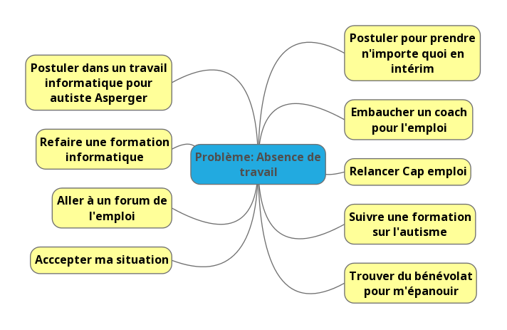 Tout d’abord il est utile d’éliminer les solutions impossibles, inacceptables, inenvisageables ou peu pertinentes sur le propos. C’est le travail, le plus difficile, car il ne réside pas en un simple décompte du positif et du négatif mais d’une réelle pondération. Par exemple, si j’ai un travail qui m’interesse vivement mais qui se trouve à 500 km, qu’il doit être pourvu la semaine prochaine, même s’il ne présente comme désavantage que la distance, il doit être écarté. Ma solution : Formation à l’autisme