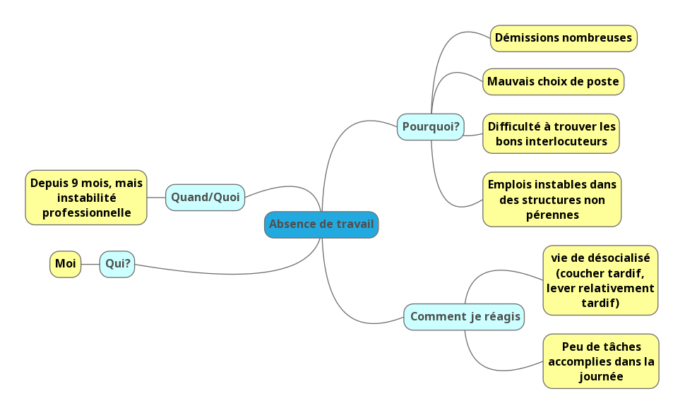 Étape 3 : Définir le problème à l’aide de questions simples (qui, quand, quoi, où, pourquoi, comment je réagis face à la situation). Dans cette partie, il est primordial que les faits observés soient mesurables. Je n’ai gardé que « trouver du travail » pour l’exemple :