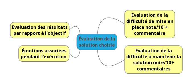 Pour faciliter la compréhension, à chaque étape ou comme ici dans les deux premières, je proposerai des mind-maping, ceux-ci garantissent un visuel simple. Un problème est par définition une situation où je dois prendre une décision ou mettre en place une action. Cela peut être aussi un état latent qui provoque des angoisses. Pour discriminer le prioritaire du non prioritaire, un point peut être la question d’impact sur la vie ou l’urgence. Dans mon cas, voici ce que j’ai noté :
