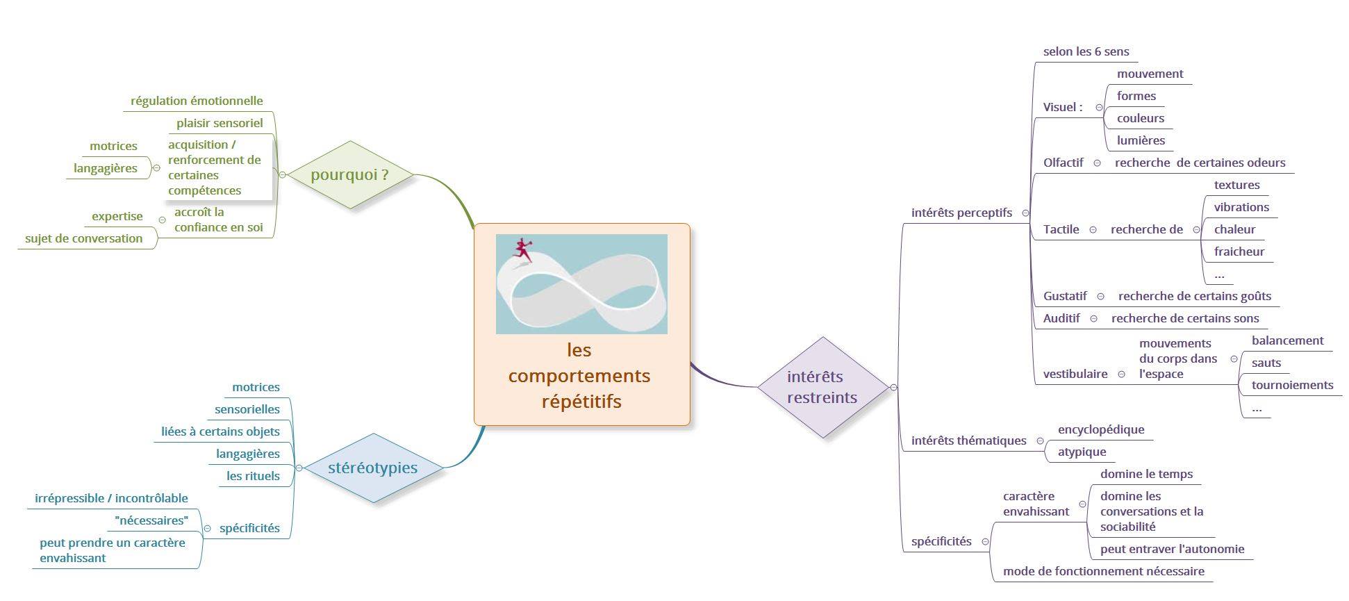 Si j’ai déjà traité les intérêts spécifiques dans l’article suivant : (Les intérêts spécifiques), je n’ai jamais abordé les thèmes des stéréotypies. Dans le DSM, les stéréotypes et les intérêts spécifiques font partie de la catégorie des comportements répétitifs. Je voulais préciser que même si j’ai une nette tendance au pessimisme, pour moi les intérêts spécifiques sont le points fort de l »autisme, de même que les stéréotypies ne doivent être visées par un accompagnement qu’en cas de très fort impact sur la vie de la personne. Aussi je vous encourage à vraiment envisager cette option quand la personne elle-même en souffre et plutôt que de les empêcher ce qui pourrait la conduire à une dépression, ou à de l’anxiété, mieux vaut chercher à la circonscrire un temps donné dans un espace bienveillant.
