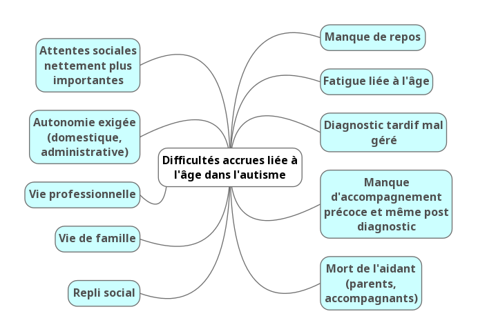 Difficile de développer un sujet qui dépend de tant de critères et dont les études sont encore trop réduites. Malgré tout, je pense qu’il est important de voir aussi qu’il est possible de bien vieillir même en étant autiste. Idéalement, la société devrait de l’enfance jusqu’à sa vieillesse, permettre un accompagnement pour toutes les personnes autistes.