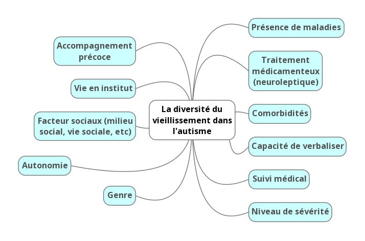 - Enfin le vieillissement dans l’autisme, comme dans la neurotypie, dépend de nombreux critères qui offriront des résultats différents selon les échantillons choisis :
