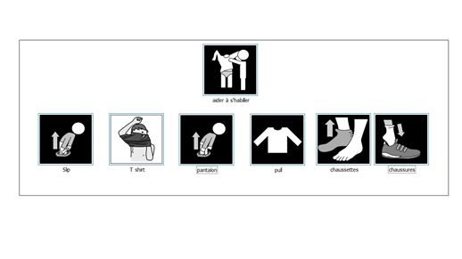 J’ai mis en place un emploi du temps semaine et quotidien. Un séquentiel habillage un autre brossage de dents et encore un pour l’autonomie, par exemple prendre la douche tout seul. Je dois réévaluer et adapter à nouveau au fur et à mesure des évolutions et de mes erreurs. Ainsi, j’ai fait une erreur dans les étapes et la représentation spatiale de son corps et de l’ordre des actions des parties à nettoyer. J’ai ensuite réalisé un séquentiel spécial cheveux. J’ai ensuite organisé un chaînage avant et il a pu se débrouiller totalement seul dès la troisième fois. Actuellement je travaille sur l’autonomie du choix des habits en fonction de la météo.