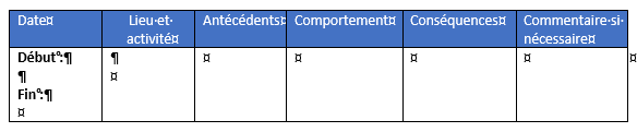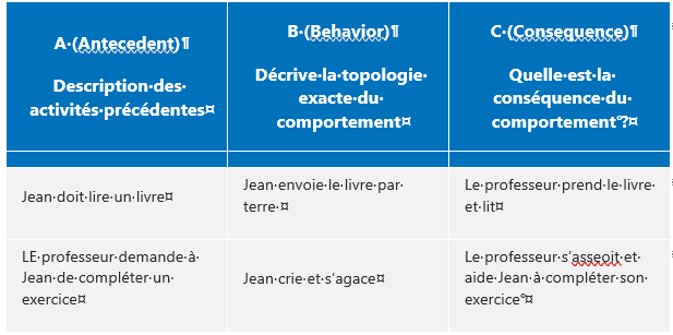 1. Les antécédents : adapter par exemple l’environnement pour que le comportement ne survienne pas , favoriser des principes de désescalade quand nous connaissons les contextes